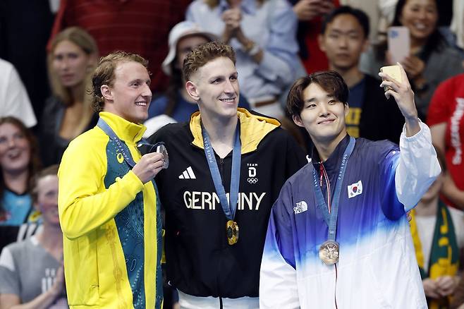 27일(현지시각) 프랑스 파리 라 데팡스 아레나에서 열린 2024 파리 올림픽 수영 남자 자유형 400M 결승 시상식에서 동메달을 획득한 대한민국 김우민이 포즈를 취하고 있다
