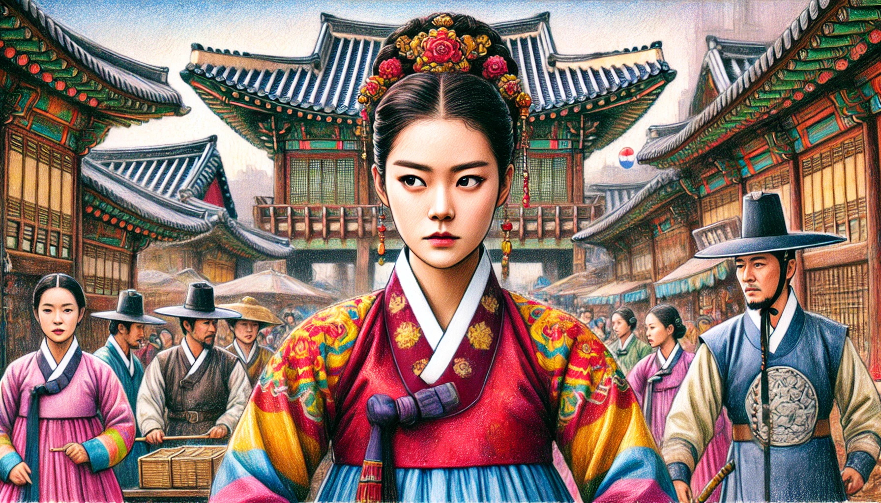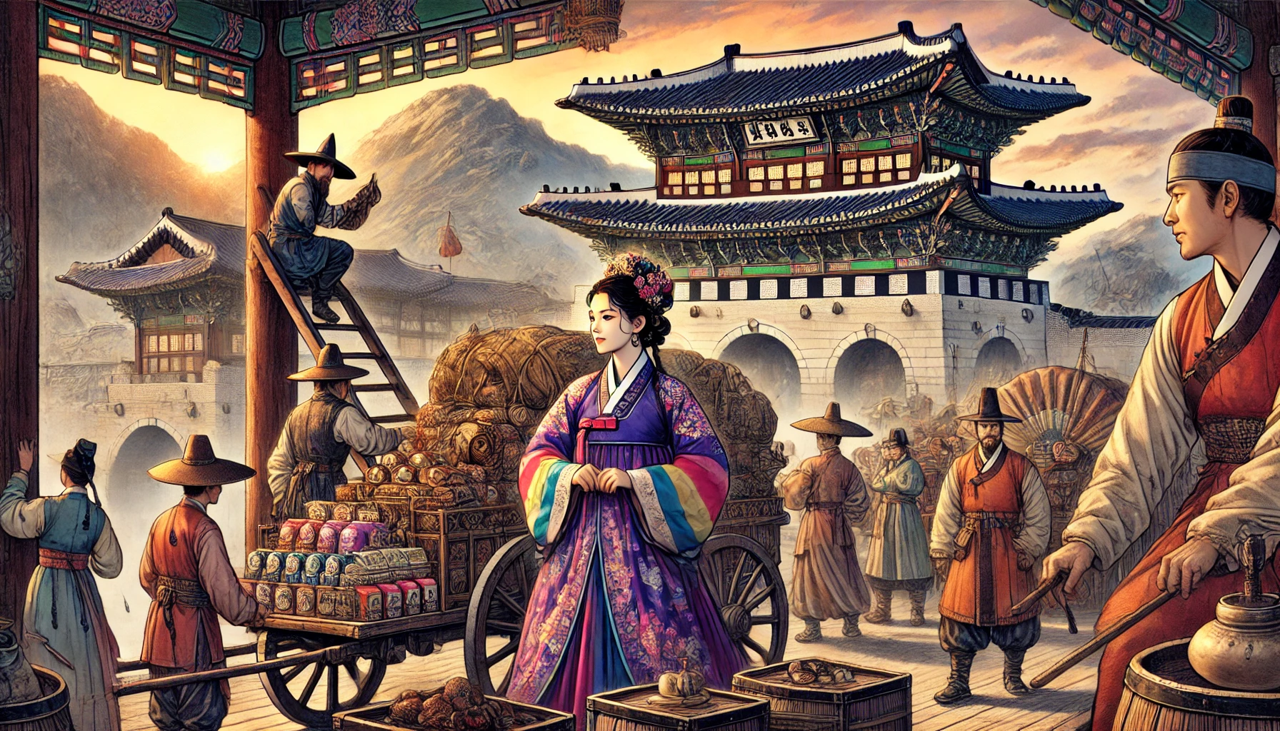 조선 후기 비단 무역로의 중심지. 작은 객점의 뒤편 좁은 방에서 정화와 그녀의 유일한 동맹 진옥이 조용히 만나고 있었다. 창문 너머로 스며드는 달빛이 그들의 얼굴을 희미하게 비추고 있었다.